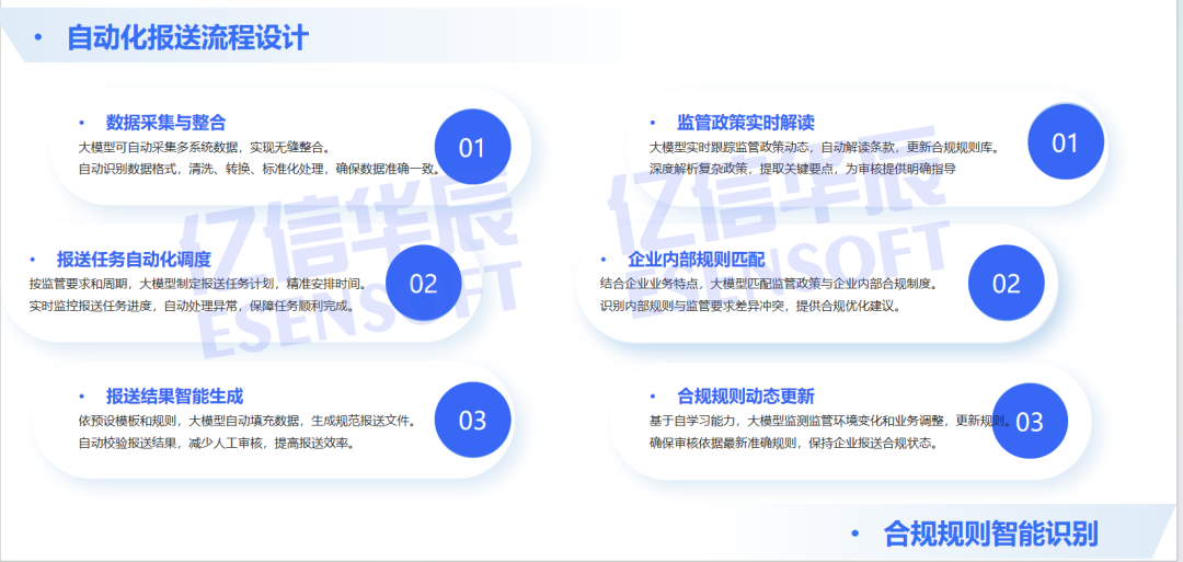 监管合规产品的智能化升级同样亮眼。针对1104、EAST等复杂报表,大模型可解析监管政策,自动生成取数规则与加工路径。某金融机构在报送流程中引入模型,实现从数据抽取、校验到生成报表的全自动化,错误率降低至0.5%以下。