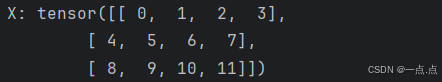print("X:", X) # tensor([[ 0, 1, 2, 3], [ 4, 5, 6, 7], [ 8, 9, 10, 11]])