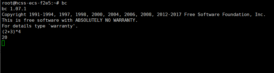 bc进入交互模式,输入(2 + 3) * 4,按回车得20;输入quit退出。