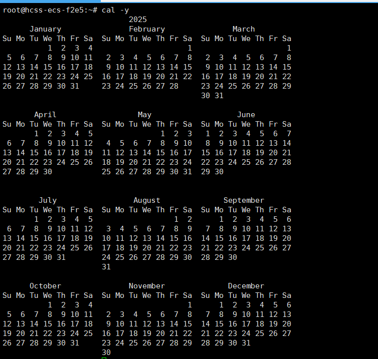 cal -3会展示三个月的月历;cal 2025显示 2025 年全年日历。