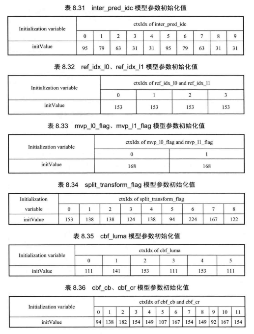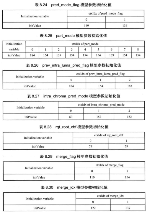 由于每个语法元素的概率分布特性不同,因此其上下文模型参数MPS和a的初始值也应该有所差异。在H.265/HEVC中,采用查表的方式来为每种语法元素进行上下文模型参数初始化。表8.19~表8.45给出了各个语法元素使用的上下文模型索引(ctxIdx)对应的模型参数初始值。在获取语法元素初始值后,计算每个语法元素就可以按照8.3.2节中描述的方法进行逐一编码。