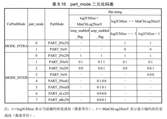 不同语法元素的概率统计分布略有差异,根据各自的特点CABAC采用不同的二元化方法。表8.15给出了采用FL、TR和EG1二元化方法的语法元素及输入参数,包括 SAO、树块分割结构、CU、PU、TU分割结构、运动信息、残差等相关语法元素。还有部分语法元素的二元化码字采用查表的方式来获取,包括part_mode、intra_chroma_pred_mode、inter_pred_idc,见表8.16~表 8.18。此外语法元素cu_qp_delta_abs 和coeff_abs_level_remaining采用基本二元化法联合的方式生成Bin串。