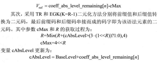 - 计算 CG内所有的非零系数的 coeff_abs_level_remaining,按照扫描顺序进行依次编码。