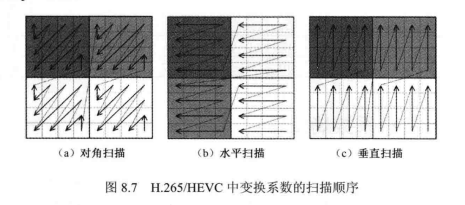 在对量化后的变换系数进行熵编码前,须先通过扫描技术将二维的变换系数排列成一维变换系数序列。扫描的顺序需要考虑变换系数幅值的分布,一般将幅度相近的系数尽量相近排列,以便于在CABAC中建立更有效的上下文模型,提高编码效率。