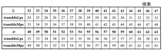 对一个 TB的变换系数进行熵编码,首先是编码 TB中的最后一个非零系数的位置。设经过扫描后的最后一个非零系数在TB中的位置坐标为(xy),x和分别表示该系数所在的列号和行号。x使用语法元素last_sig_coeff_x_prefix和last_sig_coeff_x_suffx 表示,y使用语法元素last_sig_coeff_y_prefix和 last_sig_coeff_y_sufix 表示。这4个语法元素值的获取过程为:将TB的行和列划分为N个区间,不同尺寸的变换块对应的N不同,变换块尺寸为4x4、8x8、16x16、32x32时,对应的N分别为 4、6、8、10。每个区间对应一个区间索引,表示该区间内的最小位置坐标,通过x和y值就可以得到它们各自所在的区间索引以及区间内的偏移量,last_significant_coeff x_prefix和last _significant_coey_prefx 就等于x和y各自所在的区间索引值,last_signifcant_coeff_x_sumx和last_signifcant_coeff_y_sux就等于x和y各自所在区间内的偏移量,区间索引值对应的最小位置坐标加上偏移量,即可分别得到x和,最终的位置坐标。表8.46给出了TB为32x32时,x或y所对应的区间索引和区间内的偏移量,以及各自的二元码。