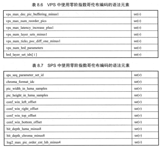 熵编码已成为视频编码中不可或缺的重要组成部分,尽管CABAC(Context-based Adaptive Binary Arithmetic Coding)具有高的压缩效率,并作为 H.265/HEVC 标准的主要编码方法。由于零阶指数哥伦布编解码简单,且对广义高斯信源的压缩效率也较高,在H.265/HEVC中,零阶指数哥伦布编码方法被用于视频参数集(VideoParameterSet,VPS)、序列参数集(Sequence Parameter Set,SPS)、图像参数集(Picture ParameterSet,PPS)和片头信息等所涉及的大部分语法元素中。具体的语法元素以及它所采用的是无符号数的指数哥伦布编码 ue(1)还是有符号数的指数哥伦布编码 se(v),见表 8.6~表 8.12。