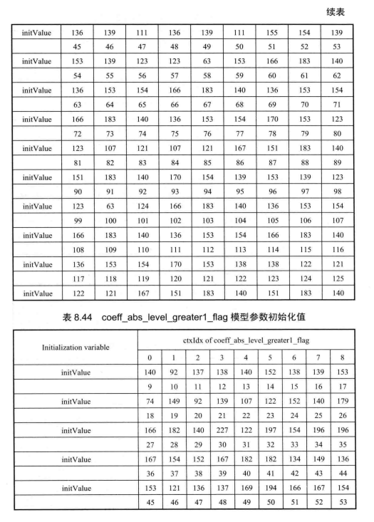 其中,coeff_abs_level_greater1_flag和coeff_abs_level_greater2_flag采用常规编码,采用的上下文模型参数初始化值见表8.44和表8.45,coeff_abs_level_remaining和 coeff_sign_flag 采用旁路编码。