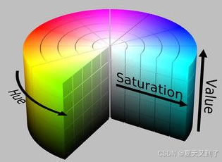 9-12所示是HSV圆柱体,表示HSV的颜色空间。HSV(Hue、Saturation、Value的首字母,分别表示颜色的色相、饱和度、强度)色彩空间是一种类似于RGB的颜色表示方式。Hue通道是颜色类型,在需要根据颜色来分割物体的应用中非常有效。Saturation的变化从不饱和到完全饱和,对应图9-12所示的灰色过度到阴影(没有白色成分)。Value描述了颜色的强度或者说亮度。
