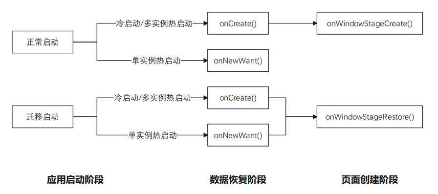 1、在应用迁移启动时,无论是冷启动还是热启动,都会在执行完onCreate()/onNewWant()后,触发onWindowStageRestore()生命周期函数,不执行onWindowStageCreate()生命周期函数。