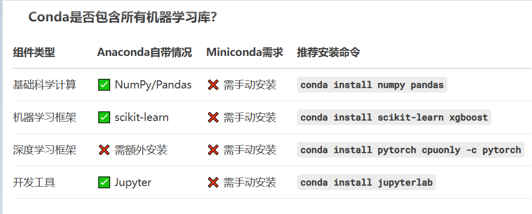 | Day 1 | 环境搭建 | 完成 Miniconda 安装并创建 ml_env 环境 |