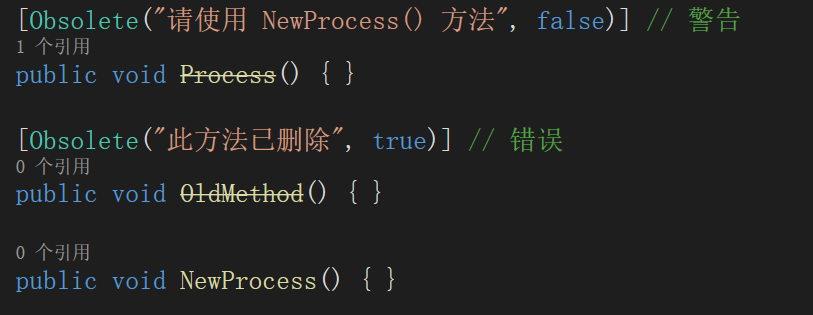 [Obsolete("请使用 NewProcess() 方法", false)] // 警告
