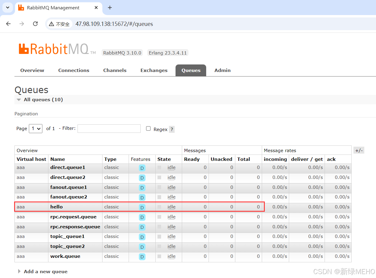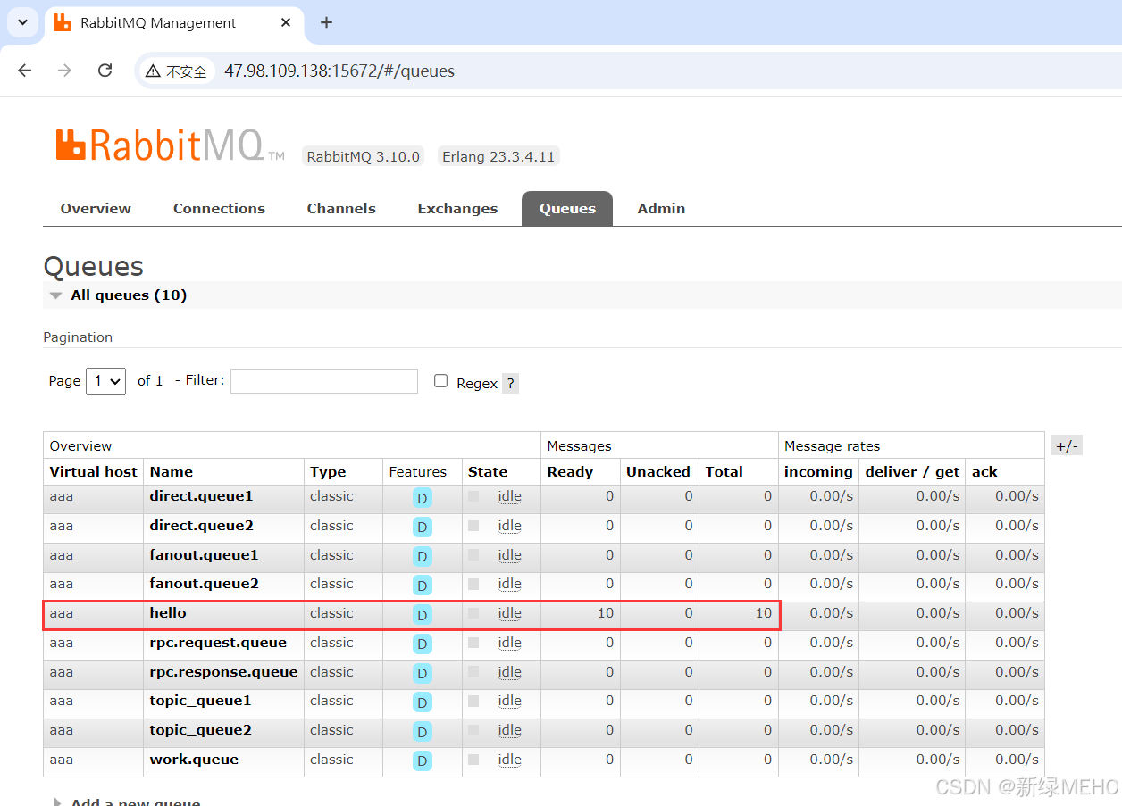 可以看到此时名为"hello"的队列中有10条消息。