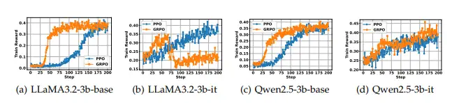 对比 PPO 和 GRPO 可见:GRPO 收敛快,PPO 相对更稳定。
