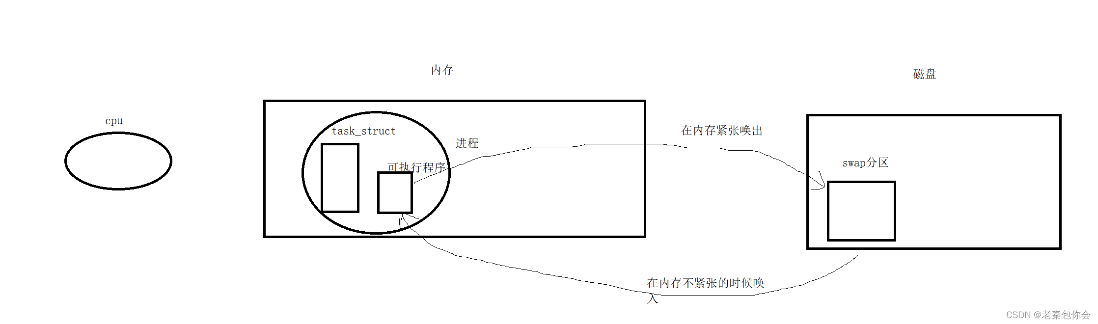 一个进程 = PCB + 可执行程序(exe),图中的左边的就是进程管理,右侧的就是内存管理,