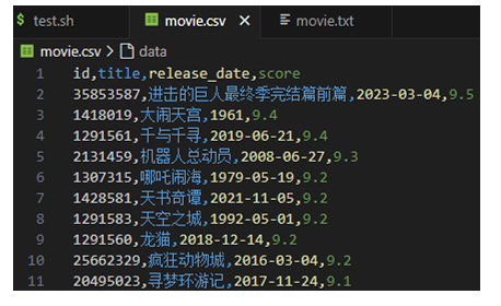 4.编写shell脚本,将数据文件movie.txt, 清洗成movie.csv格式(注意分数需要降序排序,标题里面需要保留空格),把csv文件使用mysqlcsv.sh(需要附上此文件代码)导入到数据库中。 附上所有代码,并将处理结果及导入数据库结果截图。(25分)