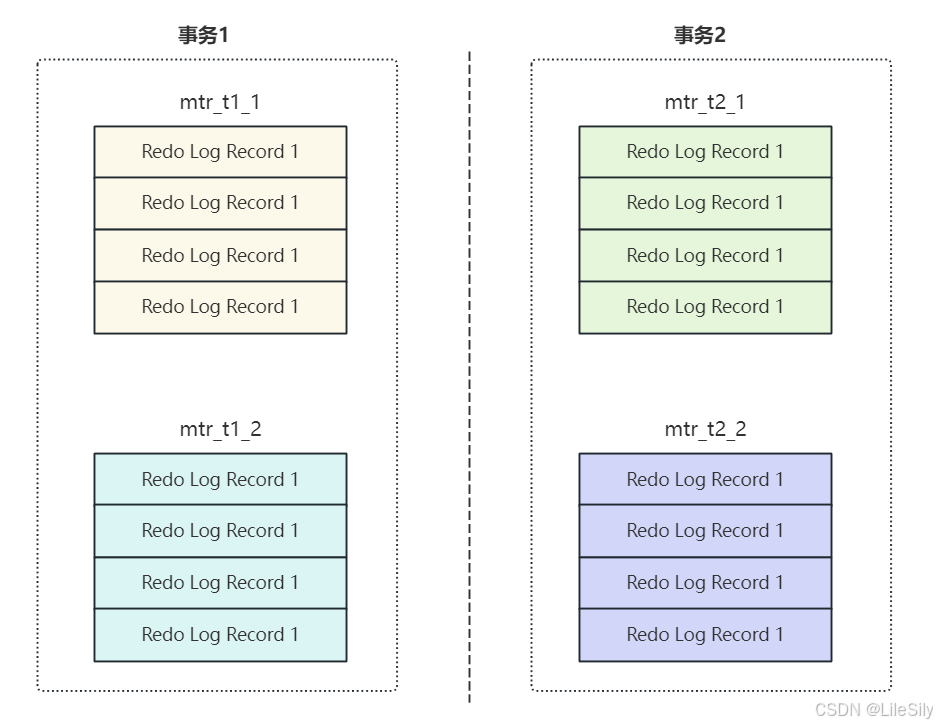 - 通过前面的介绍了解到,InnoDB以MTR为单位记录RedoLog,一个事务中包含多个MTR,一个MTR包含到多条RedoLog,这些RedoLog时一个不可分割的日志组.