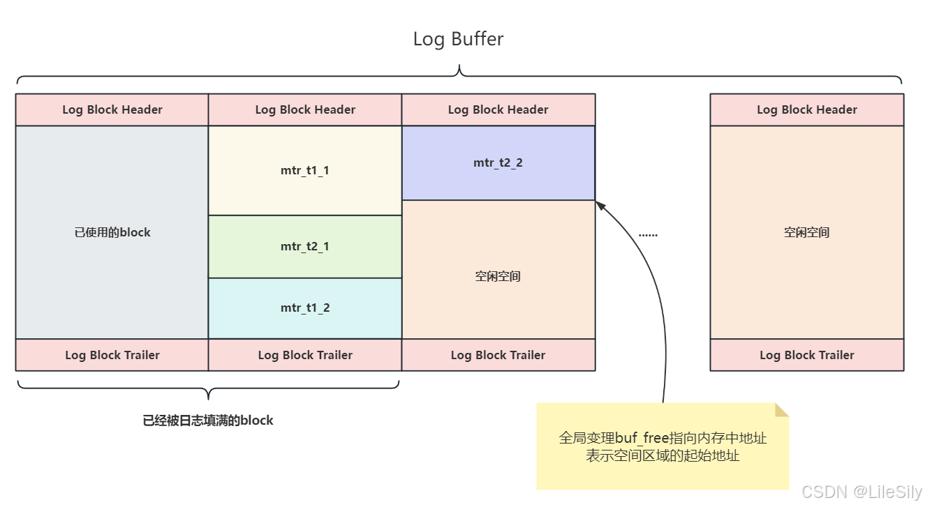 InnoDB提供了一个名为buf_free的全局变量,该变量表示后后续写入日志在LogBuffer中的其实位置,如图所示: