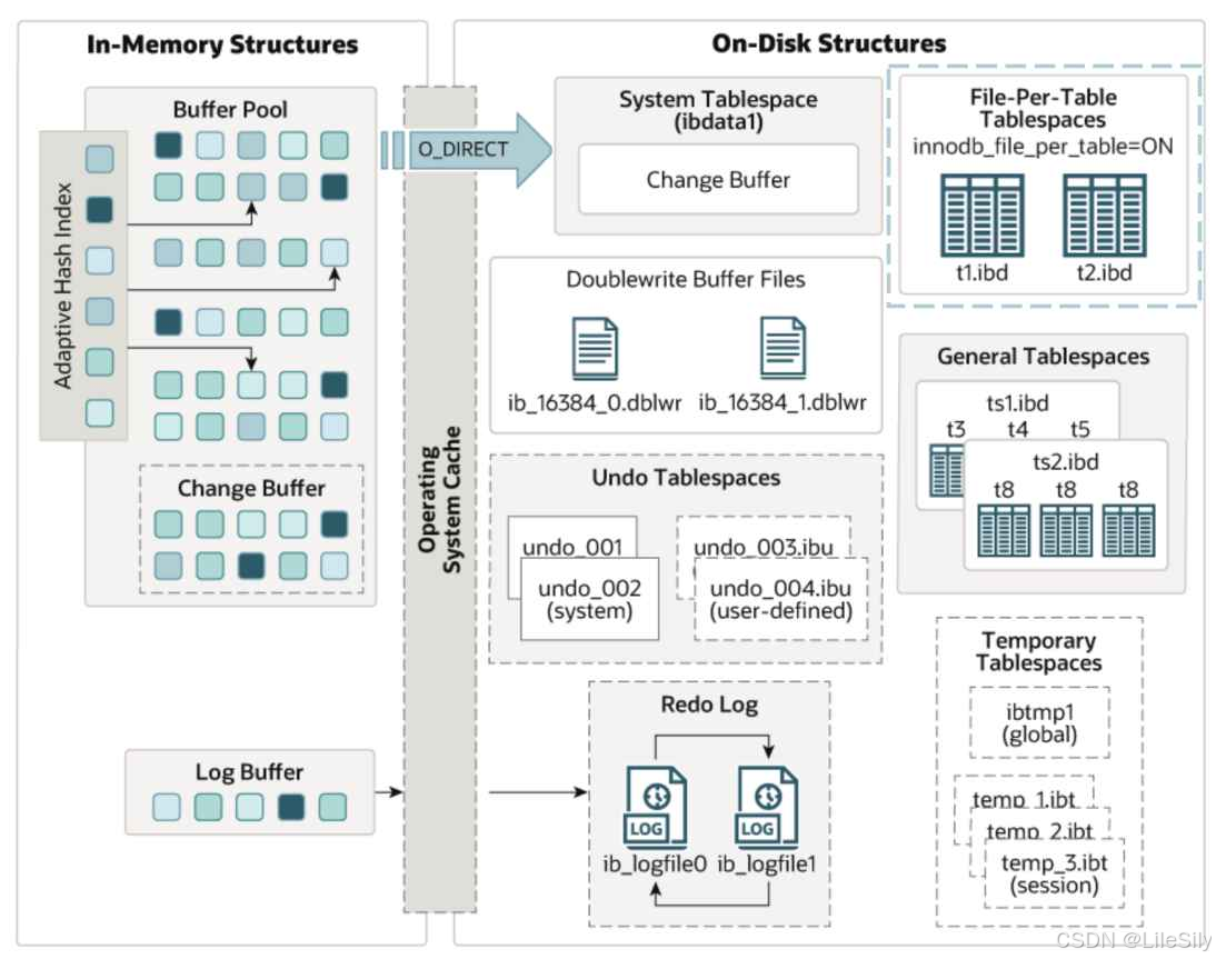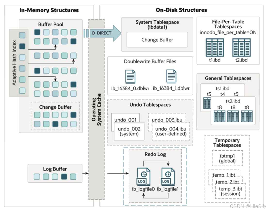 包含系统表空间文件,双写缓冲区,撤销表空间文件(Undo),重做日志文件(Redo),独立表空间文件(File-Pre),