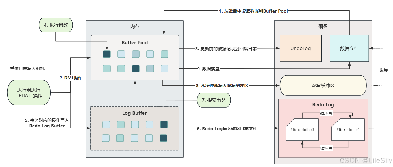 - 经过分析可以看出,判断日志文件中的RedoLog是否可以覆盖的依据是他对应的数据页是否已经刷新到磁盘.