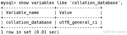 []是可选项CHARACTER SET: 指定数据库采用的字符集COLLATE: 指定数据库字符集的校验规则