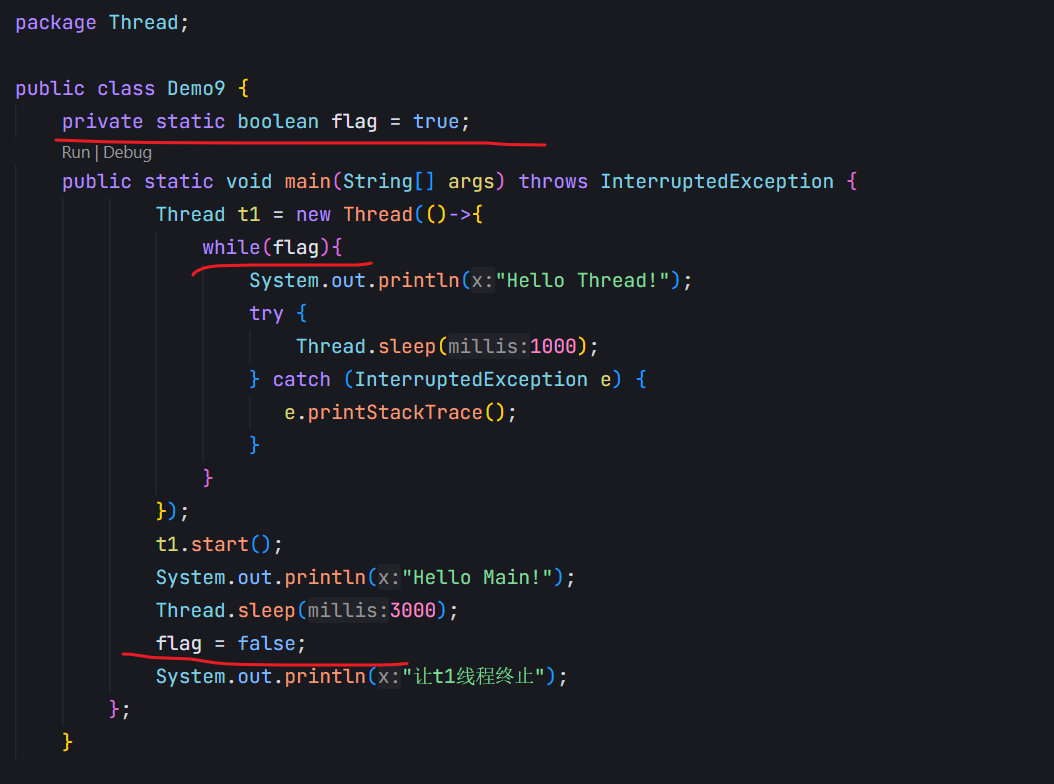 Thread对象中,包含了一个boolean变量。如果该变量为false,说明没有人去尝试终止这个线程,如果为true,说明有人尝试终止。