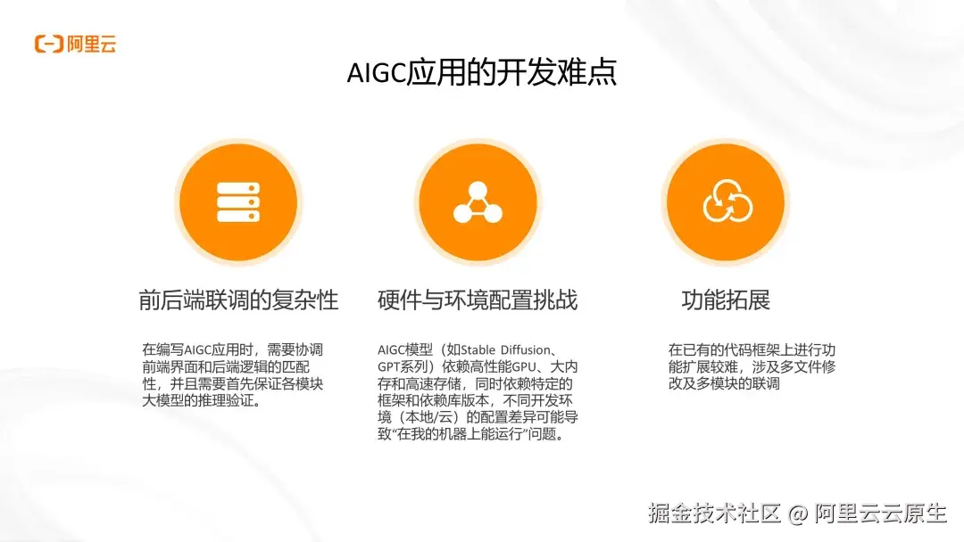 接下来讨论的是 AIGC 开发中遇到的挑战,首先是前后端联调的复杂性。在开发 AIGC 应用时,需要同时考虑前端界面和后端逻辑,并确保它们的匹配。此外,还需要保证各个模块和大模型推理验证的准确性。如果由个人单独编写,可能会遇到许多问题,需要针对多个文件进行反复的调整,以达到匹配。