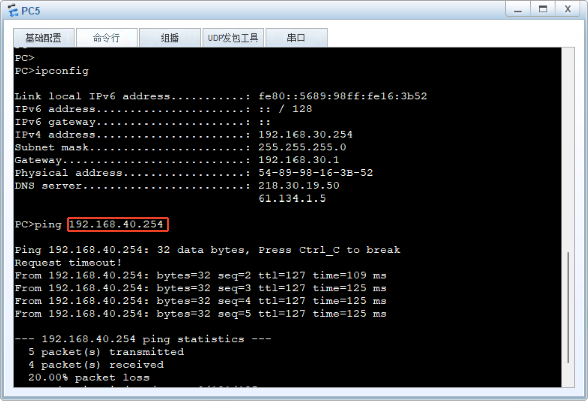⑤PC3 ping PC5 不通(生产部门与管理部门之间不可访问)