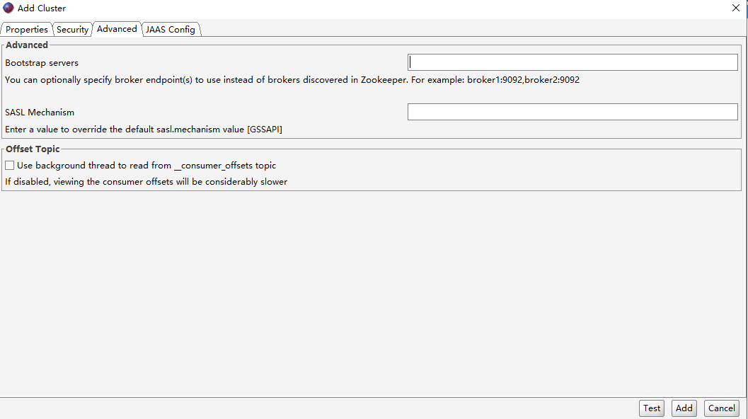 1、下载安装完毕,进行新增连接,启动offsetexplorer.exe,在Add Cluster窗口Properties 选项下填写Cluster name 和 kafka Cluster Version
