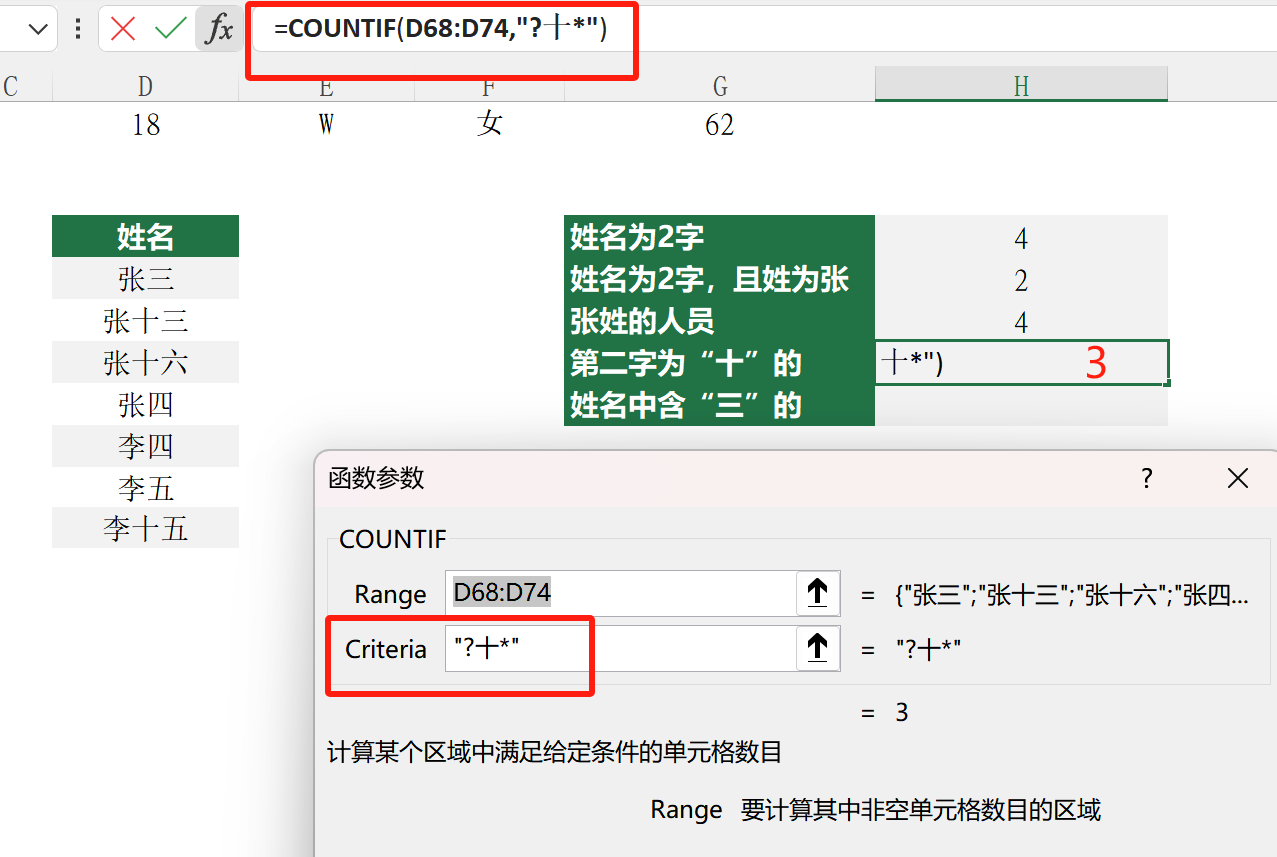 countif 第一个参数是计算的区域,第二个是满足的条件。(打开 fx 面板)