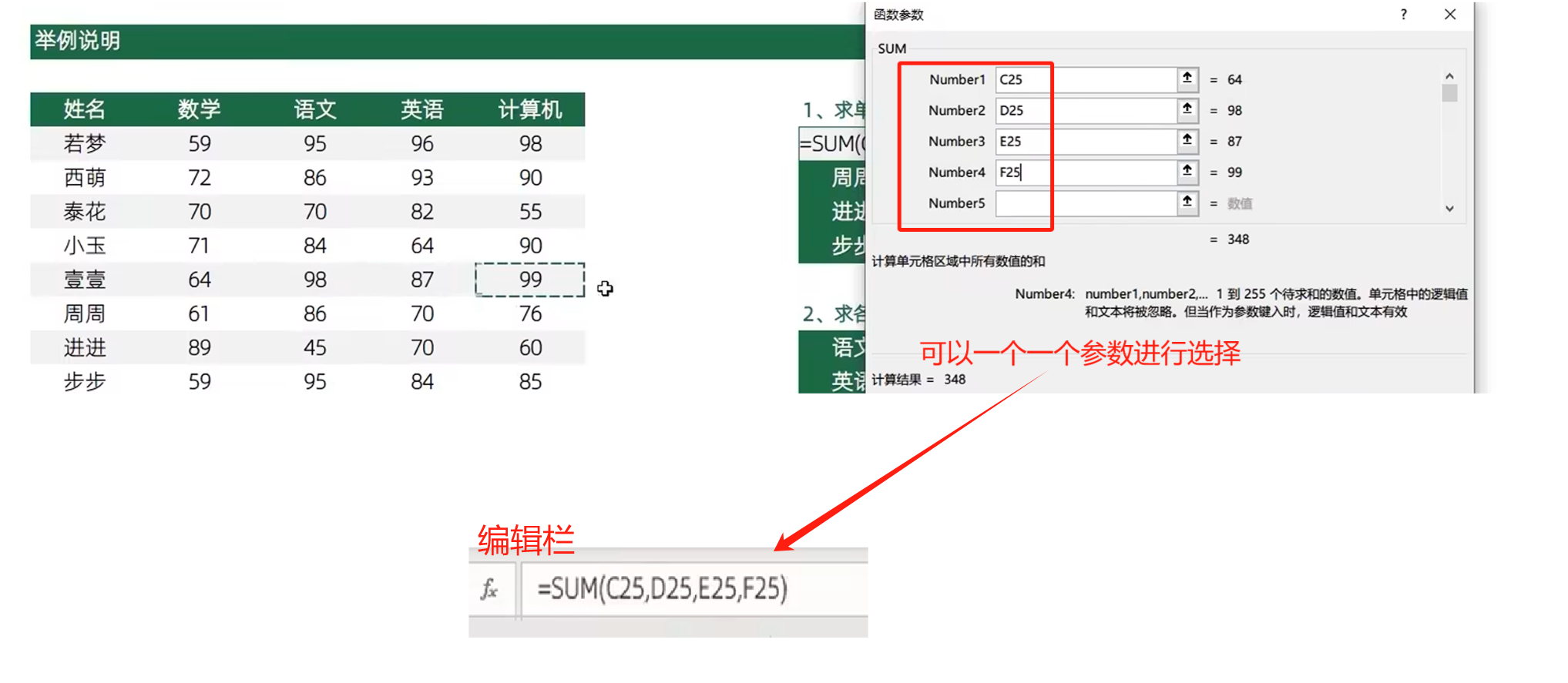 分别点击各个数值,中间用加号连接。这样很不方便,所以有了函数。