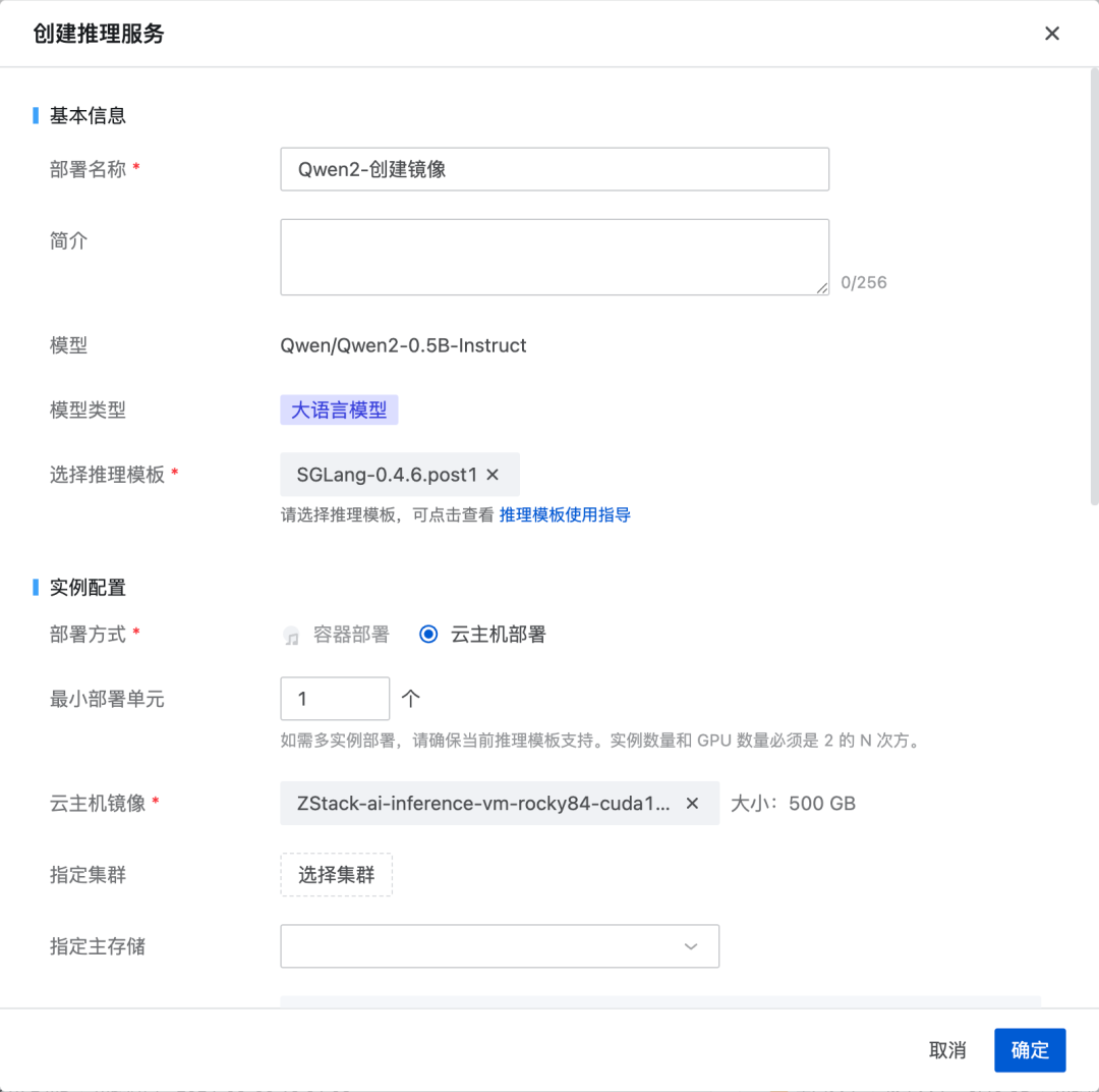 由于最新的 SGLang 版本为0.4.6.post1,因此我们将推理模板名称设置为 SGLang-0.4.6.post1,实例配置选择 "云主机"