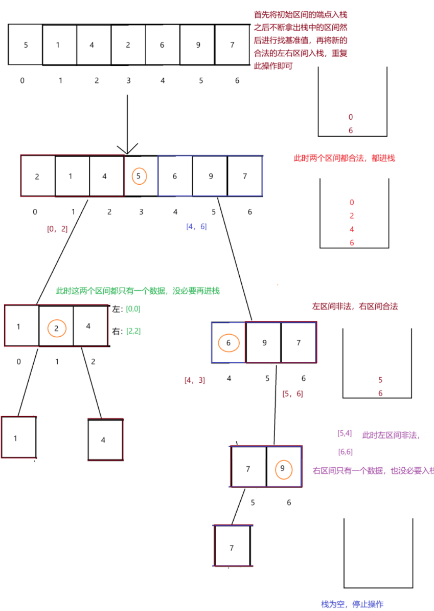 上面是快速排序 的过程,不断拿基准值 划分两块区间,一直到只剩一个元素,那么这个区间自己就是有序的,主要就是找基准值 的操作,下面分为两种找基准值的方法: