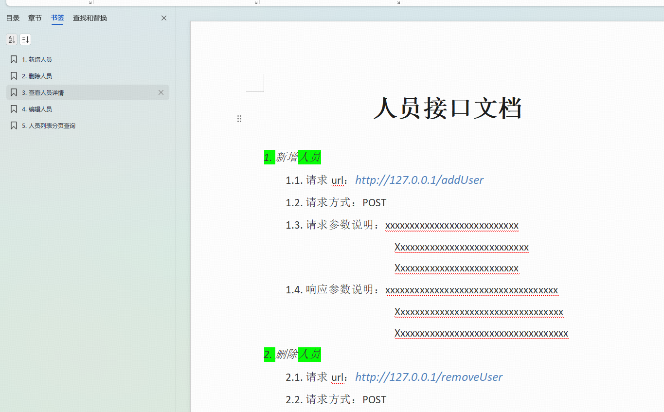 即读取文档的每一行内容,检测到该行文本以 "http://127.0.0.1" 开头则将其上一行设置为书签,请结合文档具体内容以及需求自行修改使用
