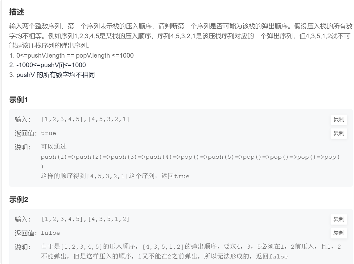 - 思路:用一个栈模拟入栈出栈的过程,模拟出与第二个序列一样的序列就合法,模拟不出与第二个序列一样的序列就不合法。