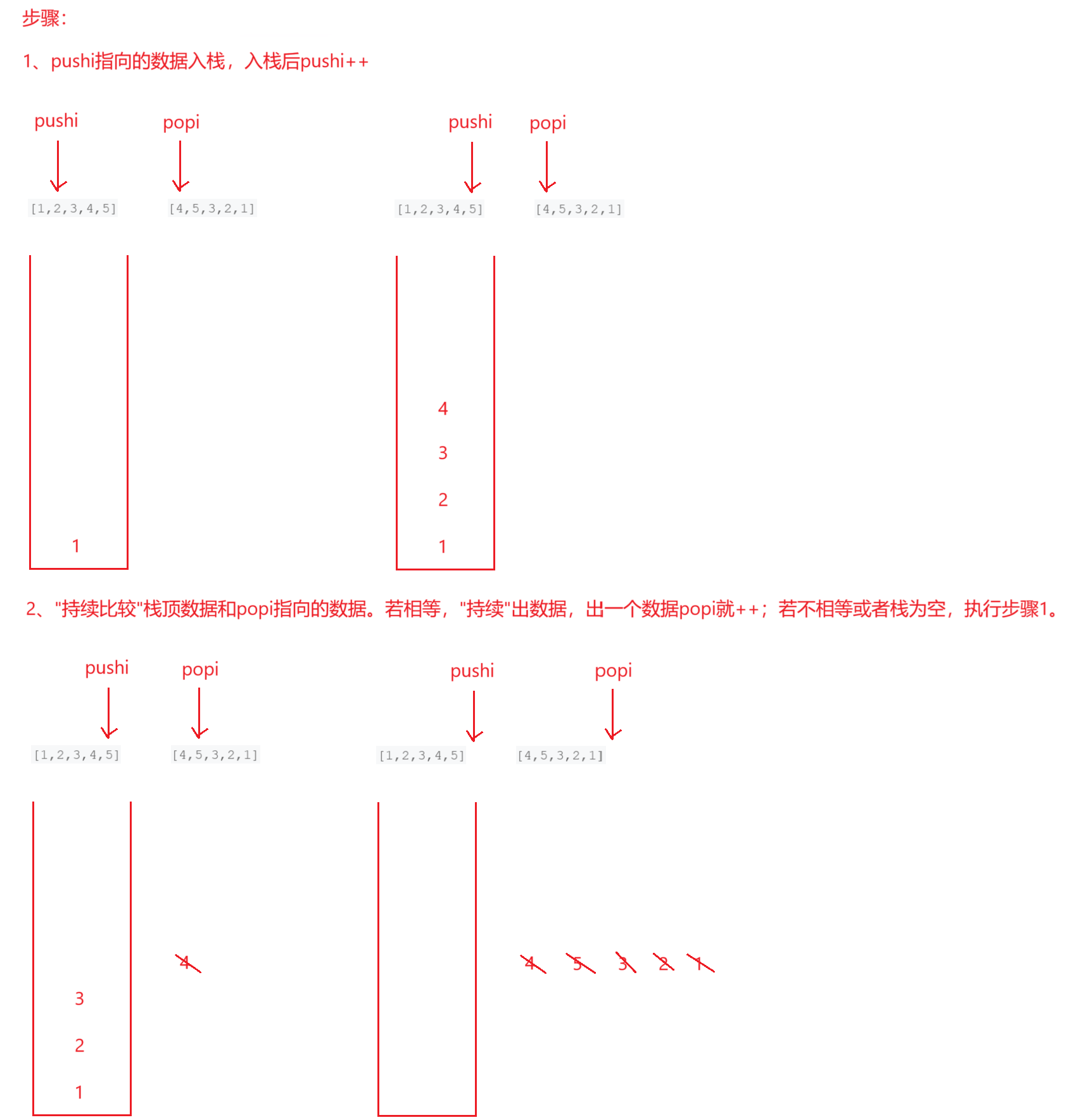 // 持续比较栈顶元素和popi指向的元素:若相等,持续出栈,popi++;若不相等或栈为空,执行步骤1