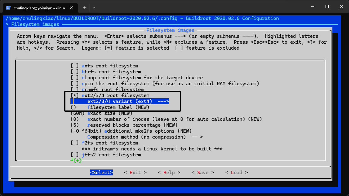 这里我们选中"ext2/3/4 root filesystem",然后在下方新弹出的"ext2/3/4 variant"选项中选择"ext4":