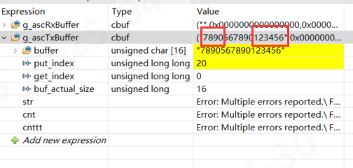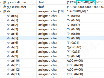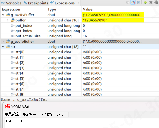 debug单步调试,串口发送1234567890,10个字节数据,DMA立马搬运到环形缓存区buffer里面,