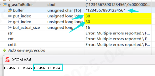 再测试一下发送和环形缓存区一样大小的数据,这里我设置的是16字节,我发送1234567890123456可以看到可以完完全全可以接收的,至此任意字节接收完美收官