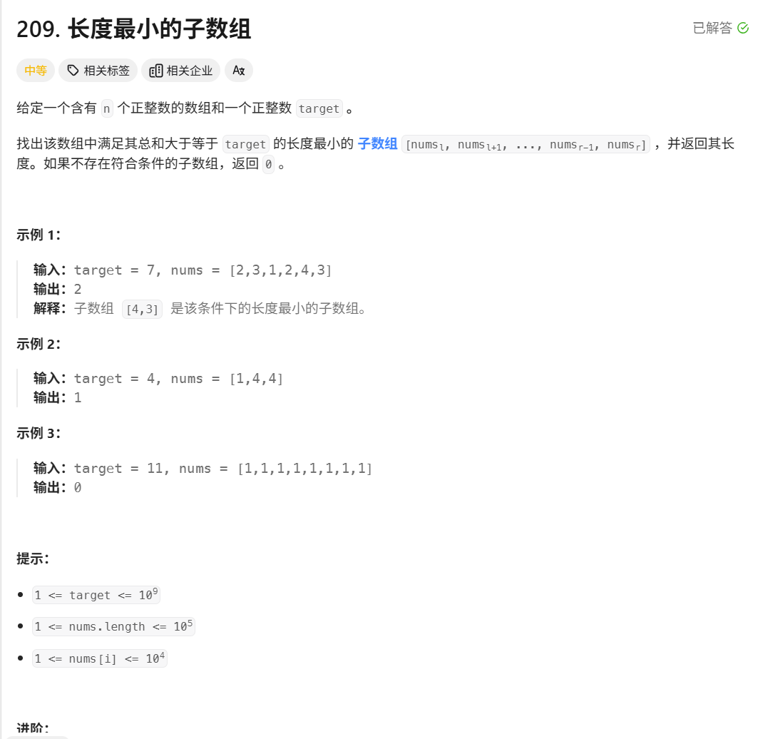 一、leetcode 209. 长度最小的子数组