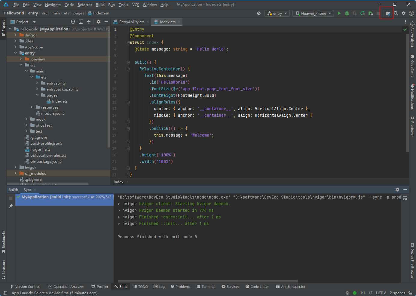 工程同步完成后,在Project 窗口,点击entry > src > main > ets > pages ,打开Index.ets文件,进行页面的编写。