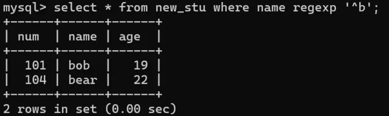 3、. 匹配任意单个字符 找名字为b?b格式的学生