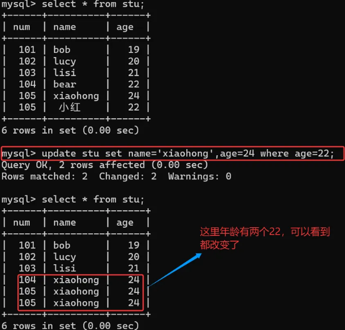 这里补充一下 cast(age as char)表示显示临时转换,将age 的类型临时转换为字符串类型