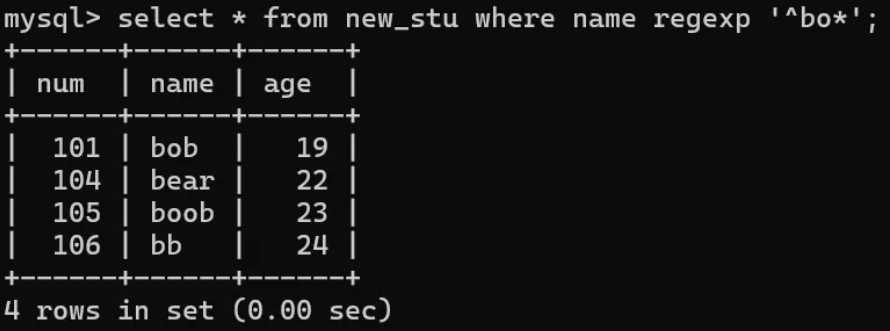 7、* 匹配零次或多次 名字以b开头,包含o零次或多次的学生