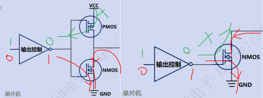 推挽输出:既可以输出高电平,也可以输出低电平,PMOS 和 NMOS 都可以导通,直接把逻辑值输出成高低电平 。