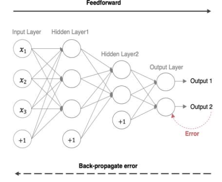 - 像大脑一样处理数据,图中有两层"脑细胞"(Hidder Layer1和Hidden Layer2)