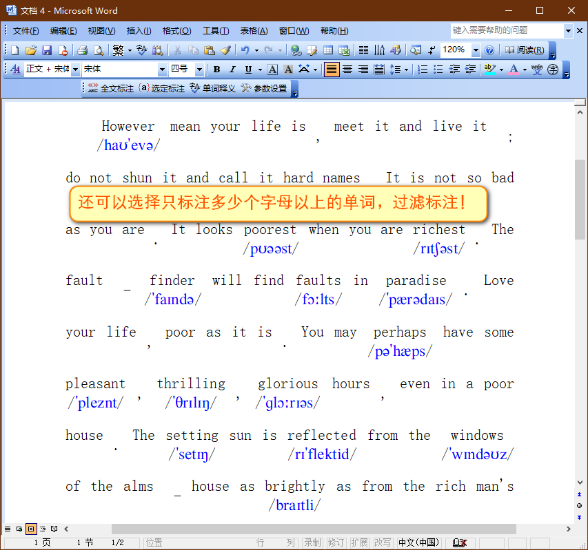 可以看到,它是一个集成在WORD或WPS中的插件,有了这个插件,就像使用WORD或WPS本身的工具按钮一样简单方便,你随时可以在WORD或WPS中点击按钮,进行全文标注,或选定标注,可以标在单词上面、下面、左侧或右侧,而且速度超快。