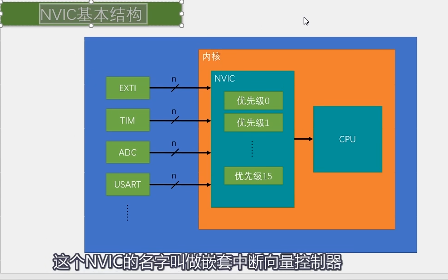 • NVIC是嵌套向量中断控制器(Nested Vectored Interrupt Controller): 它是一种硬件结构,用于管理微控制器中的中断和异常。NVIC可以设置中断的优先级,控制哪些中断可以被处理,以及管理中断的嵌套调用。简单来说,NVIC就是中断的"交通警察",确保微控制器能够正确响应和处理来自不同外设的中断请求。