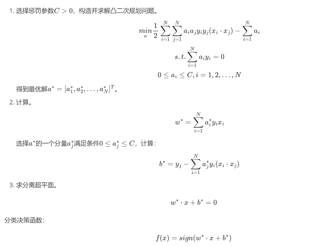 称为惩罚参数,C值越大,对分类的惩罚越大。与线性完全可分求解思路一样,这里需要先用拉格朗日乘子法得到拉格朗日函数,再求其对偶问题。
