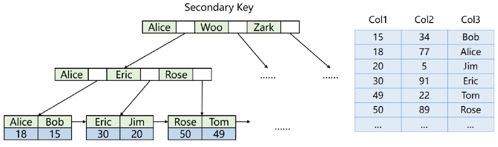 那么就需要创建目录page,这个page里面只存其管理的page的最小主键所对应的数据,如下就是示意图,最下面的就是里面有数据的page,然后上一层就是只存放目录的page,