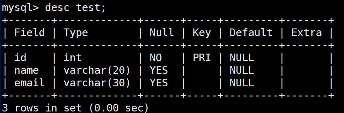 create table 表名(id int primary key, name varchar(20), email varchar(30));